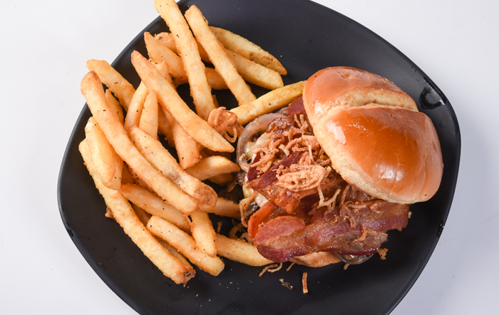 Brisket chuck blend, sautéed onions & mushrooms, bacon, smoked Gouda, crispy shallots, brava sauce, brioche bun.