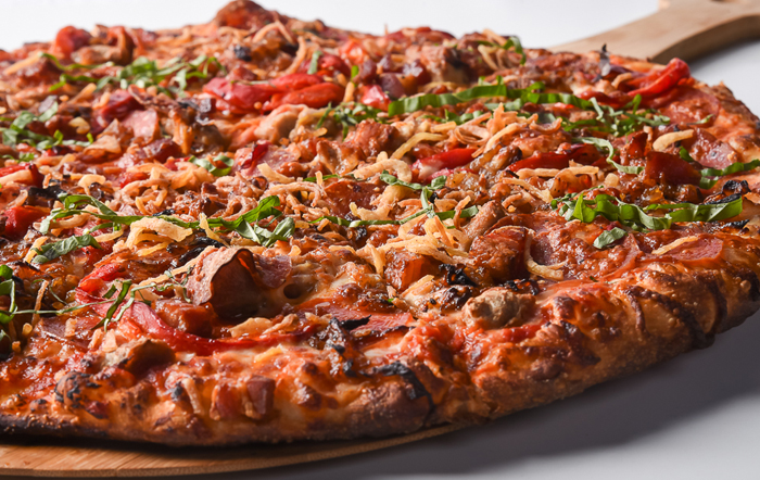 House made marinara, smoked mozzarella, pepperoni, pancetta, Italian sausage, salami, caramelized onions, roasted red bell peppers, pepper Jack cheese & crispy shallots.