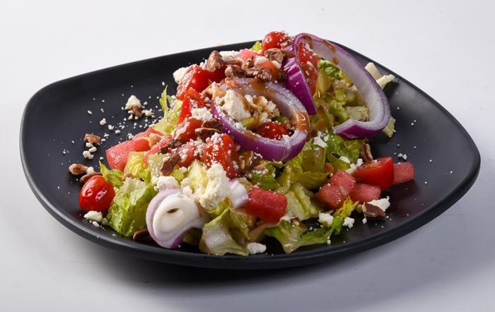 Romaine, watermelon, cucumber, tomato, red onion, feta cheese, toasted pecans, Balsamic vinaigrette.