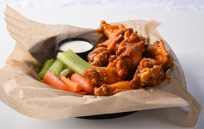 Chicken wings (traditional), choice of buffalo sauce, hot honey BBQ sauce, sweet Thai chili sauce. Served with pickled jalapenos, fresh veggies, ranch dressing.